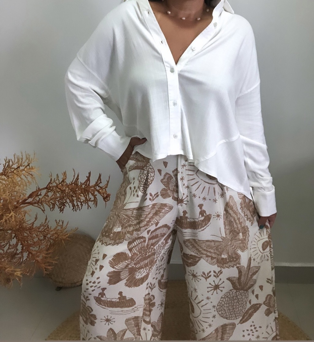 Pantalona bem soltinha , com bolsos na laterais e elástico na cintura na parte de trás