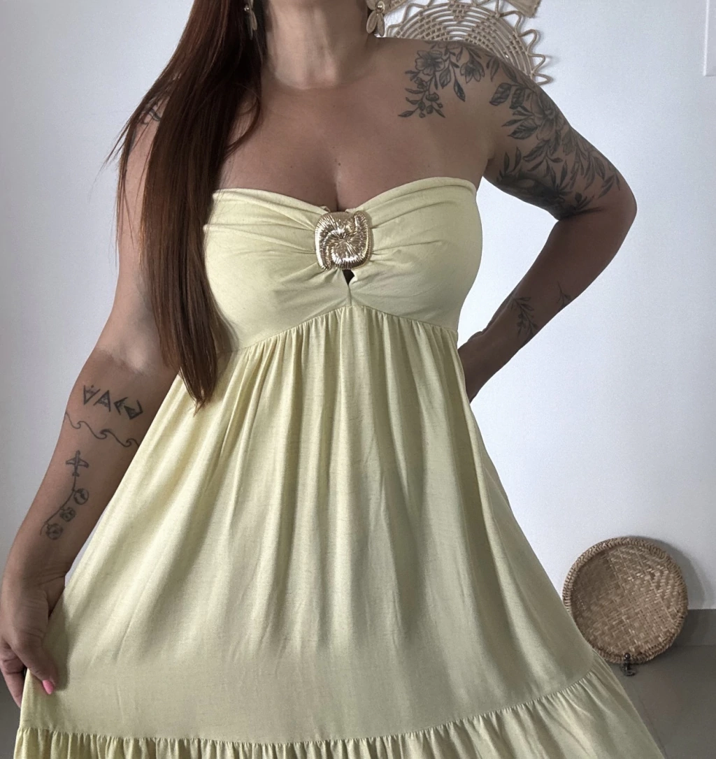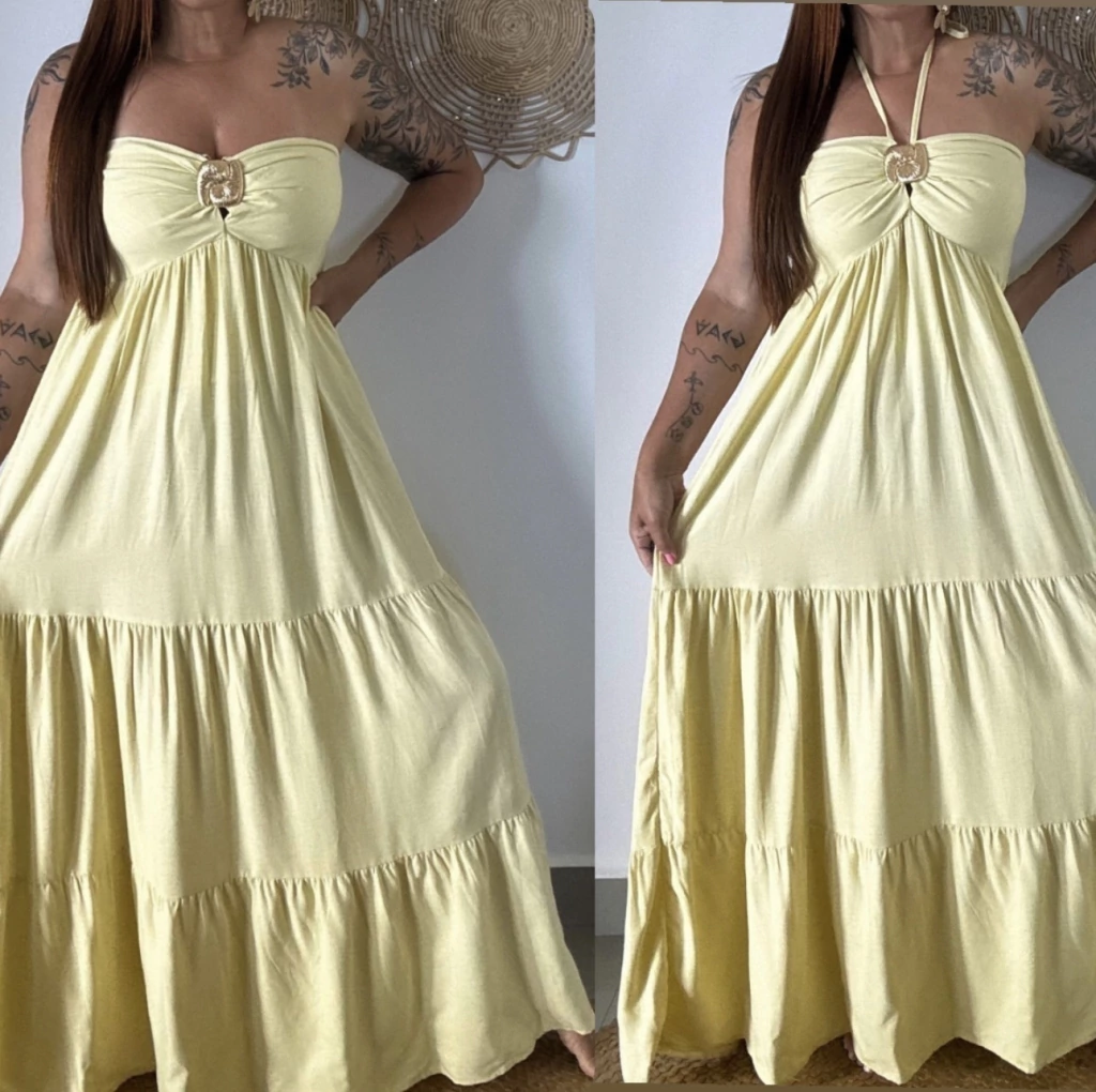 vestido longo tomara que caia e amarração no pescoço e lastex nas costas dando amplitude na peça .