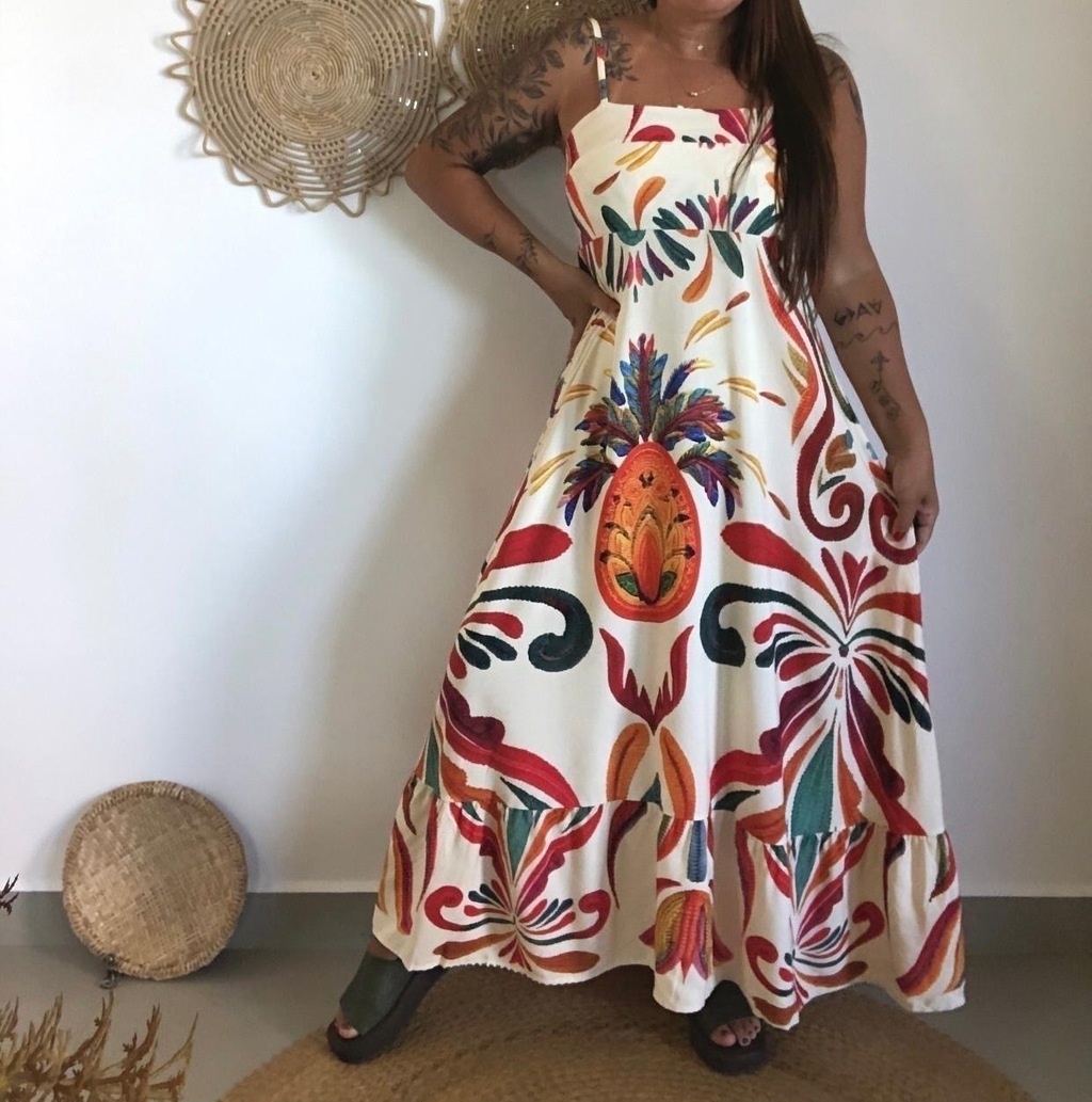 vestido longo decote quadrado, com alças reguláveis , lastex nas costas dando amplitude na peça
