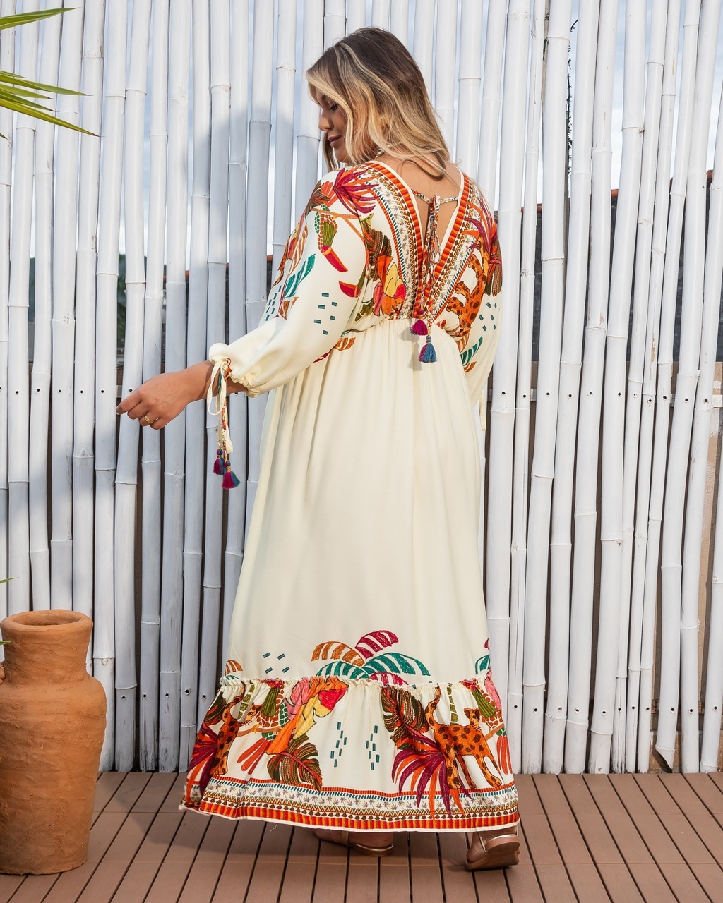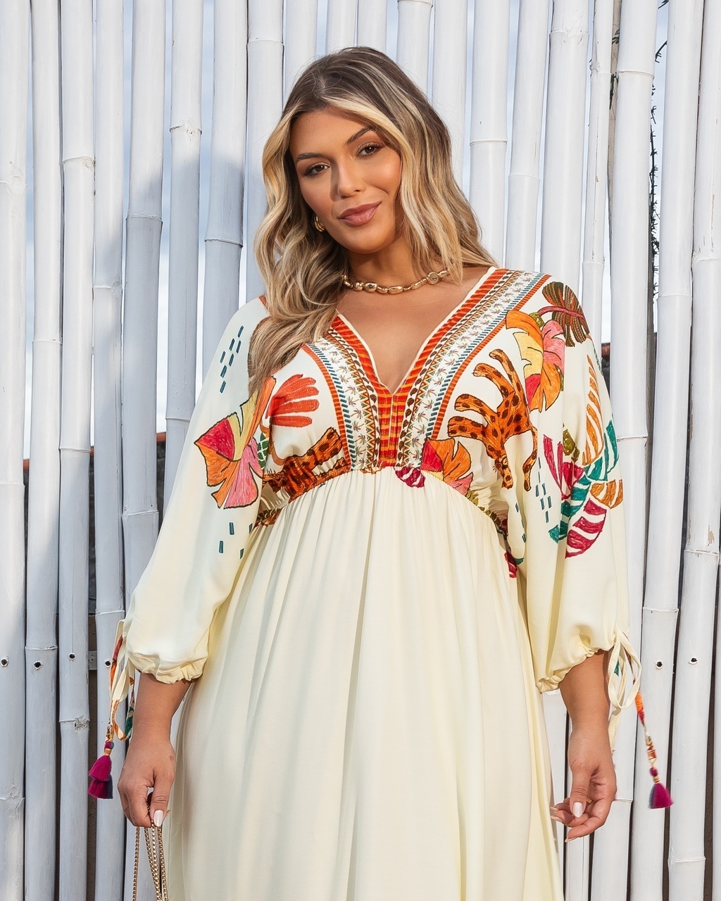 Vestido longo com elástico e Pompom nas mangas , elastico na cintura dando a amplitude na peça , com amarração nas costas com Pompom , tecido não é transparente